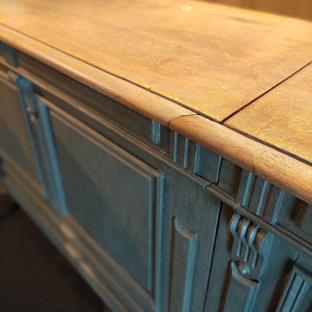 Deze unieke oud grenen toog is hand gepatineerd. Afmetingen: 368br x 58diep x 91H