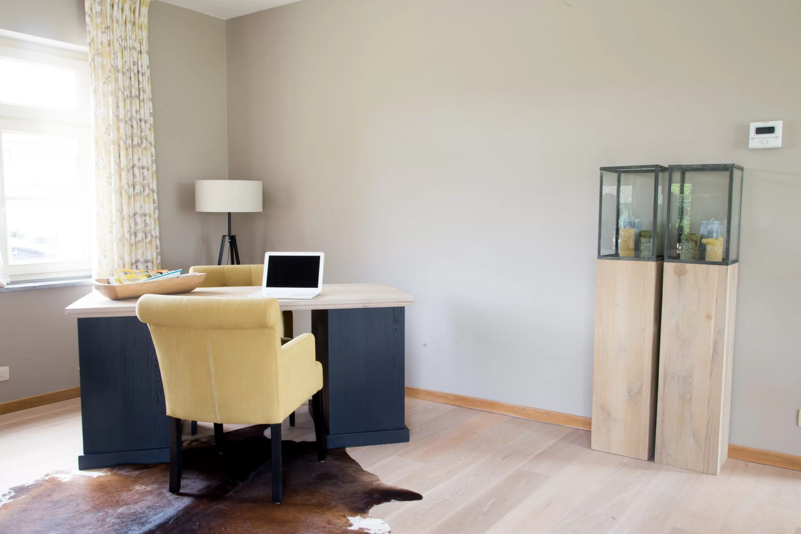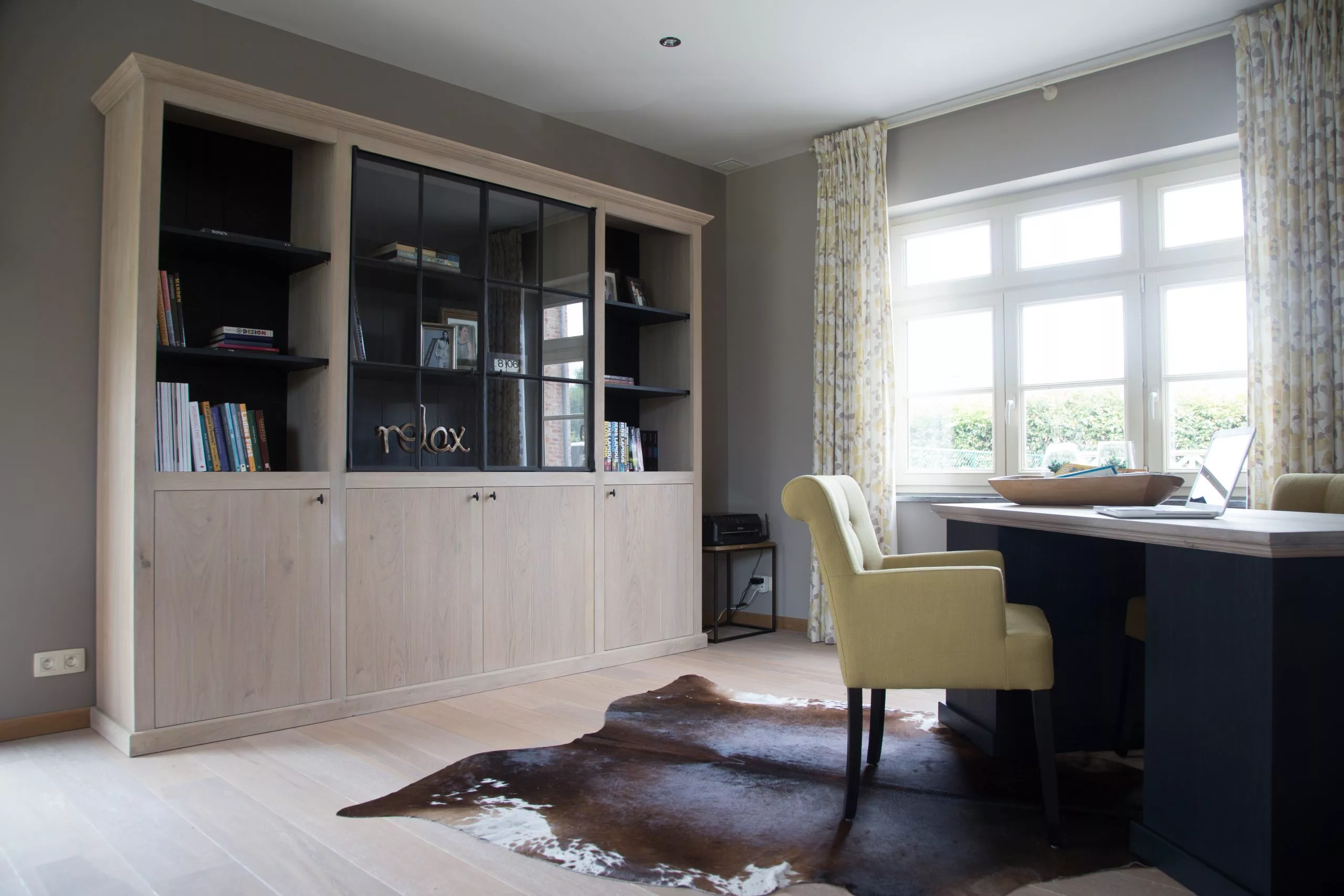 Voor het bureau zelf werd er met naturel en geschilderd eiken gewerkt. De kleuren verwijzen ook naar het tv-meubel in de woonkamer.