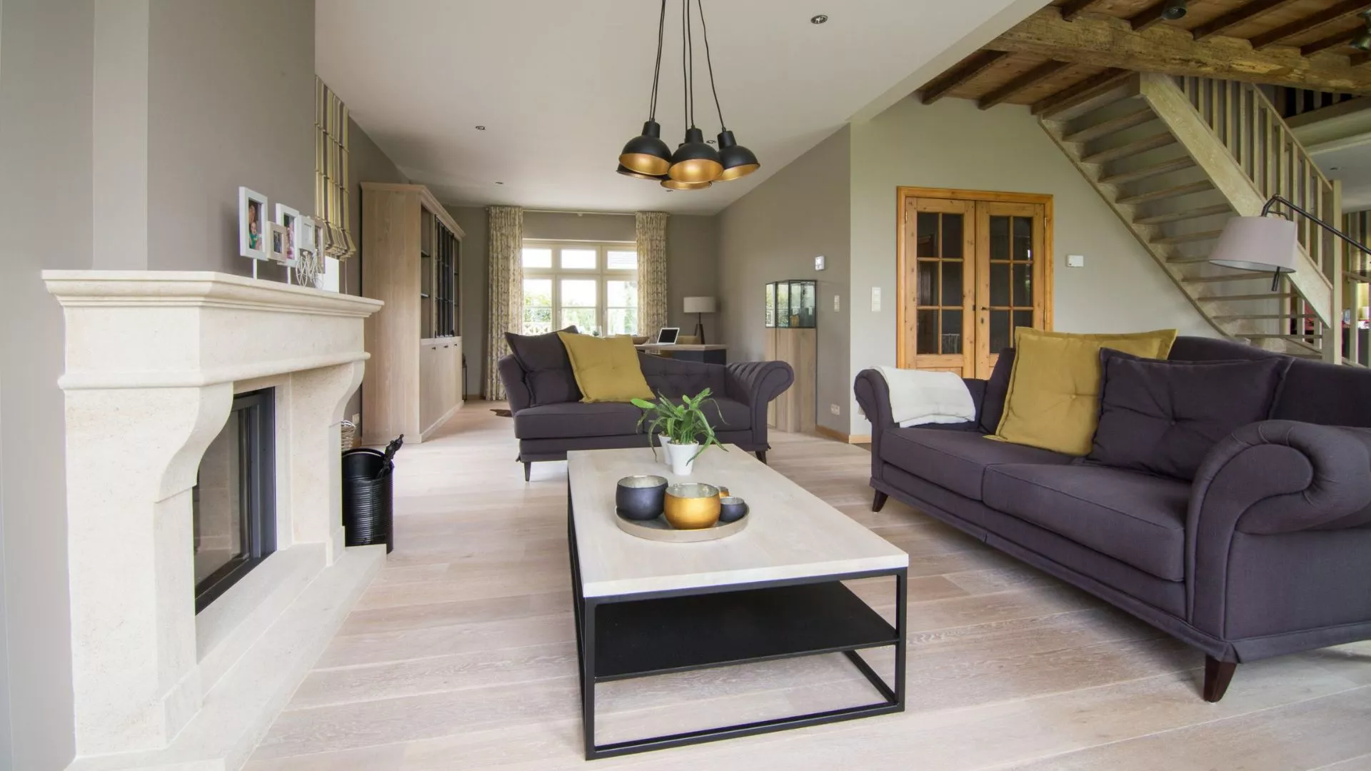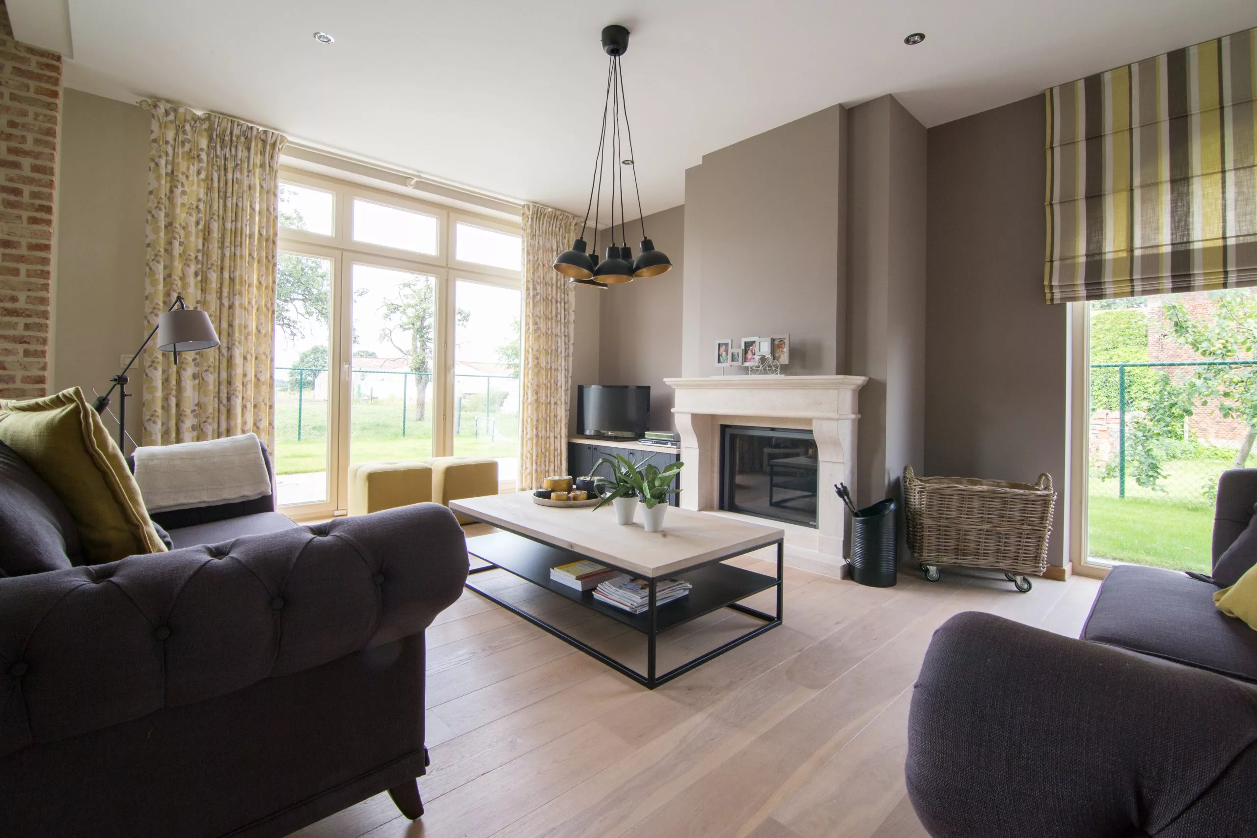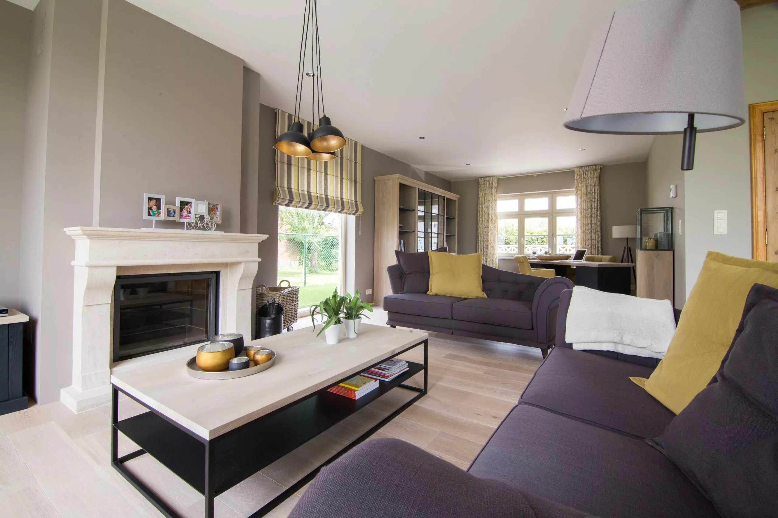 Voor de woonkamer werd gewerkt met een iets klassieker model van zithoek, maar door de keuze van de bekleding krijgt deze toch een meer eigentijdse uitstraling.